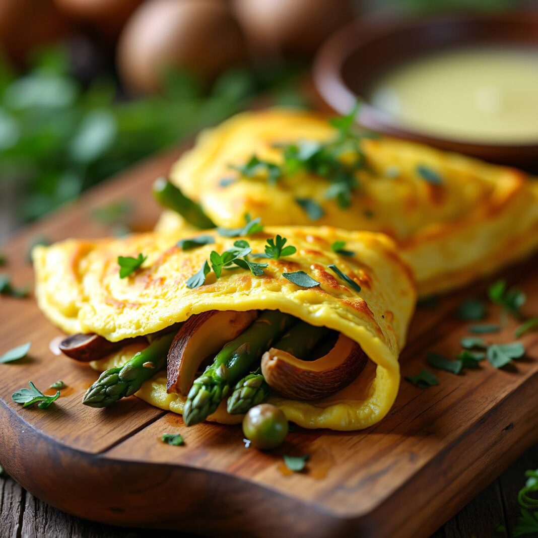 Leckere Omeletten gefüllt mit einer köstlichen Mischung aus grünen Spargeln und frischen Morcheln.