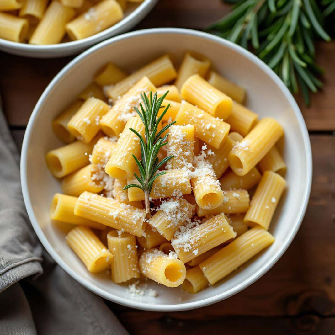 4. Richten Sie die Rigatoni und Kartoffeln in tiefen Tellern an. Bestreuen Sie das Gericht mit frisch geriebenem Hartkäse und garnieren Sie es mit Rosmarin.