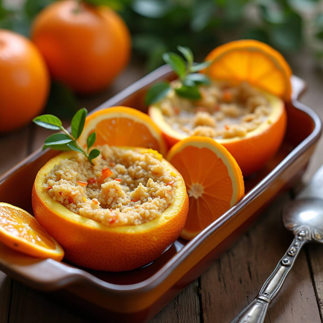 Ein köstliches Dessert aus Orangen, gefüllt mit einer cremigen Hirsefüllung und verfeinert mit Grand Marnier.
