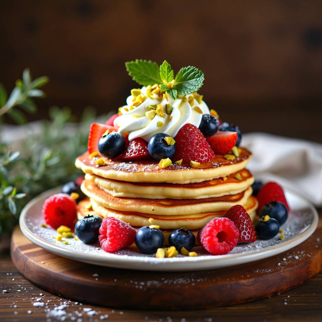 Ein köstliches Rezept für fluffige Pancakes, serviert mit gegrillten Früchten und Pistazien-Obers.