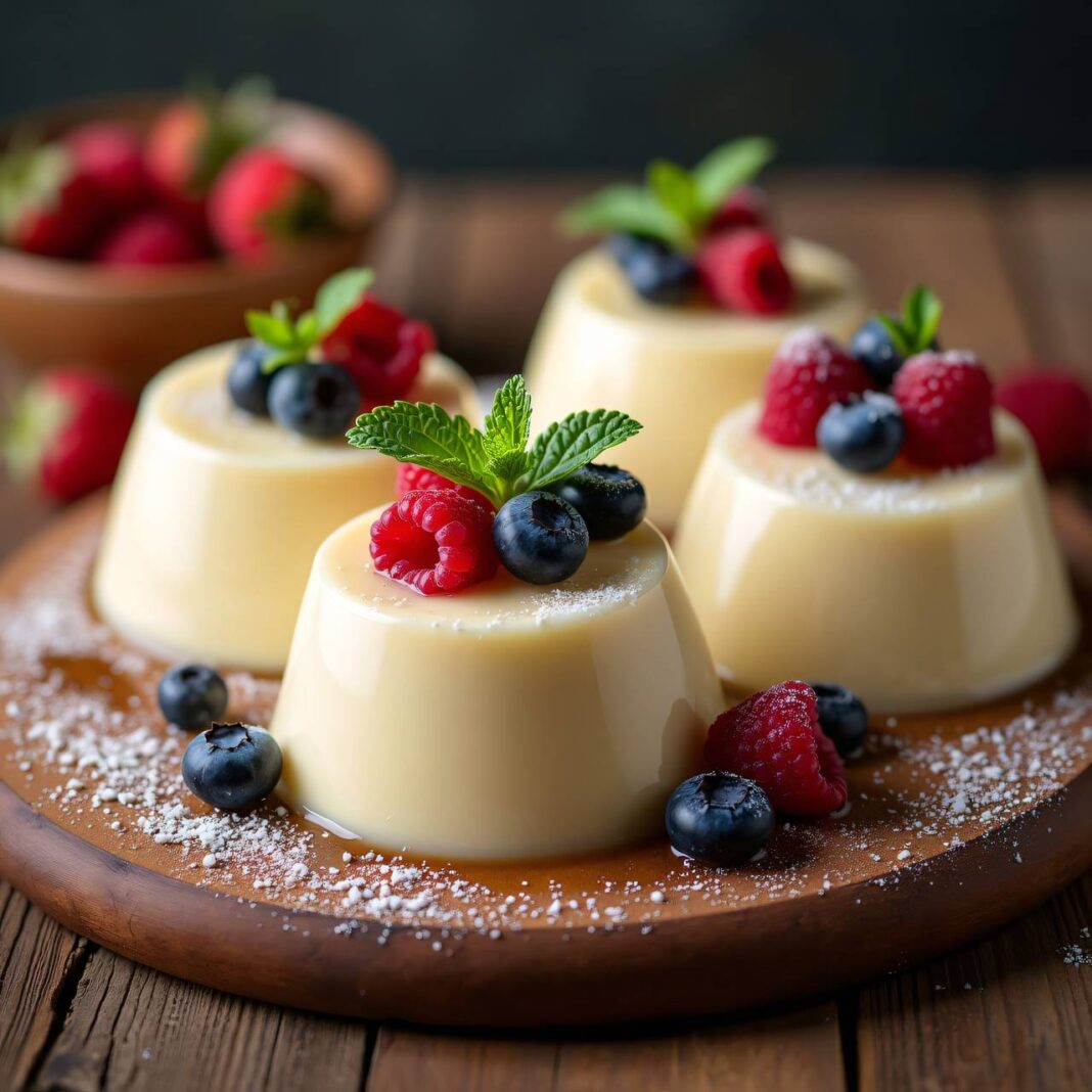 Servieren: Tauchen Sie die Förmchen kurz in warmes Wasser, um die Panna Cotta zu lösen. Verwenden Sie ein spitzes Messer, um die Ränder vorsichtig zu lösen, und stürzen Sie die Panna Cotta auf einen Teller.