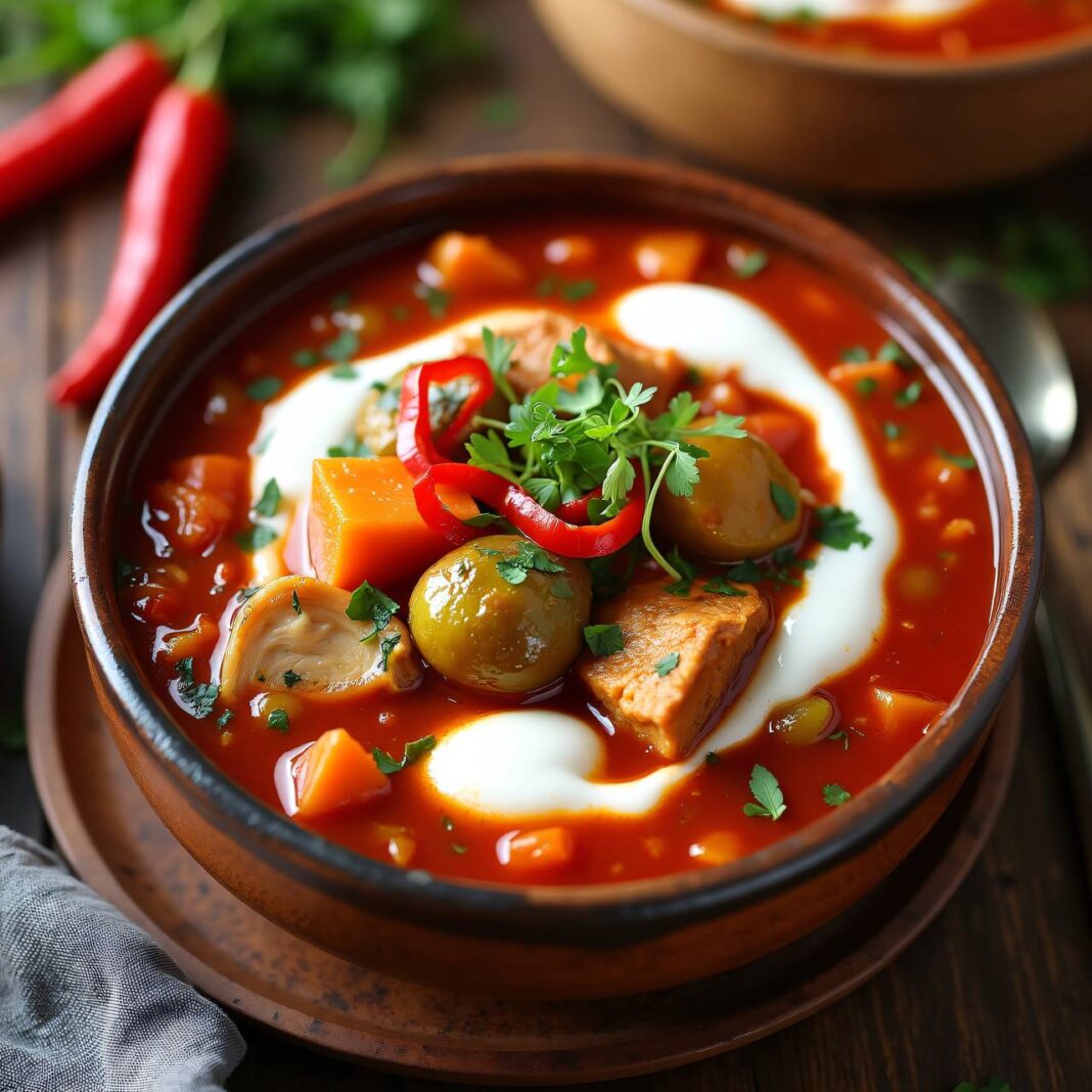 Ein herzhaftes Gulasch mit Hühnerbrustfilet, buntem Gemüse und einer cremigen Note durch Sauermilch.