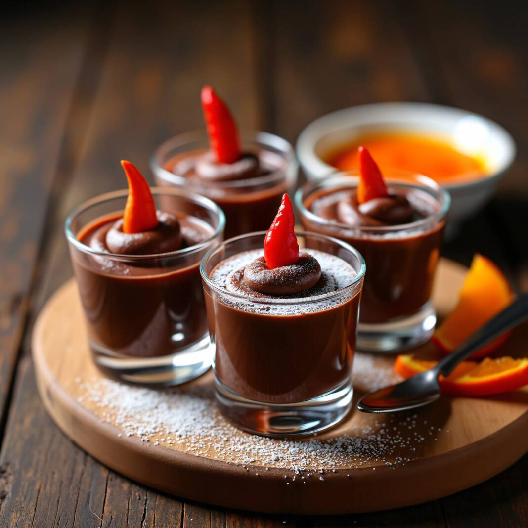 Ein köstliches und kreatives Dessert aus dunkler Schokolade und rotem Paprika, serviert mit einer erfrischenden Orangensauce.