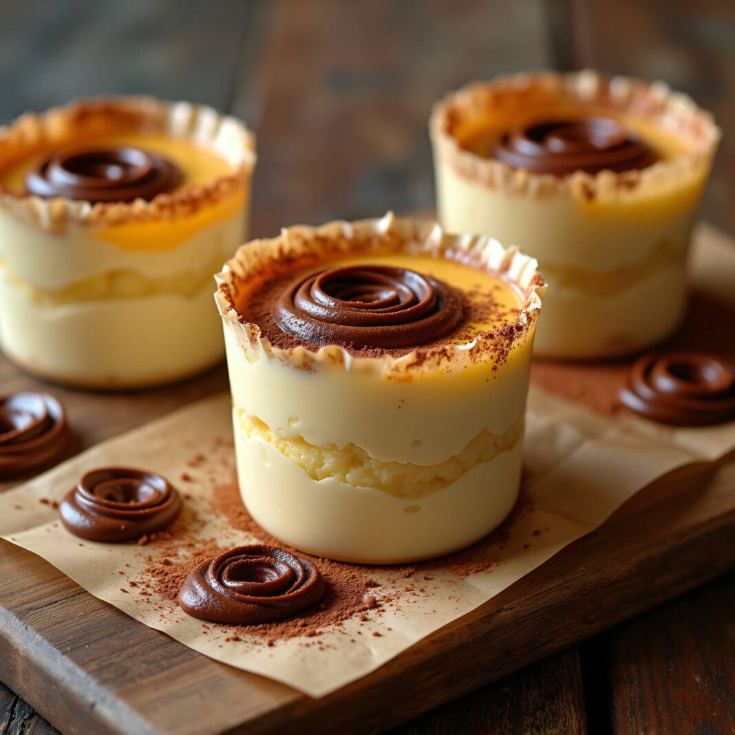 Servieren: Nehmen Sie die Förmchen etwa 20 Minuten vor dem Servieren aus dem Tiefkühler. Bestäuben Sie die Parfaits mit Kakaopulver und garnieren Sie sie nach Belieben.