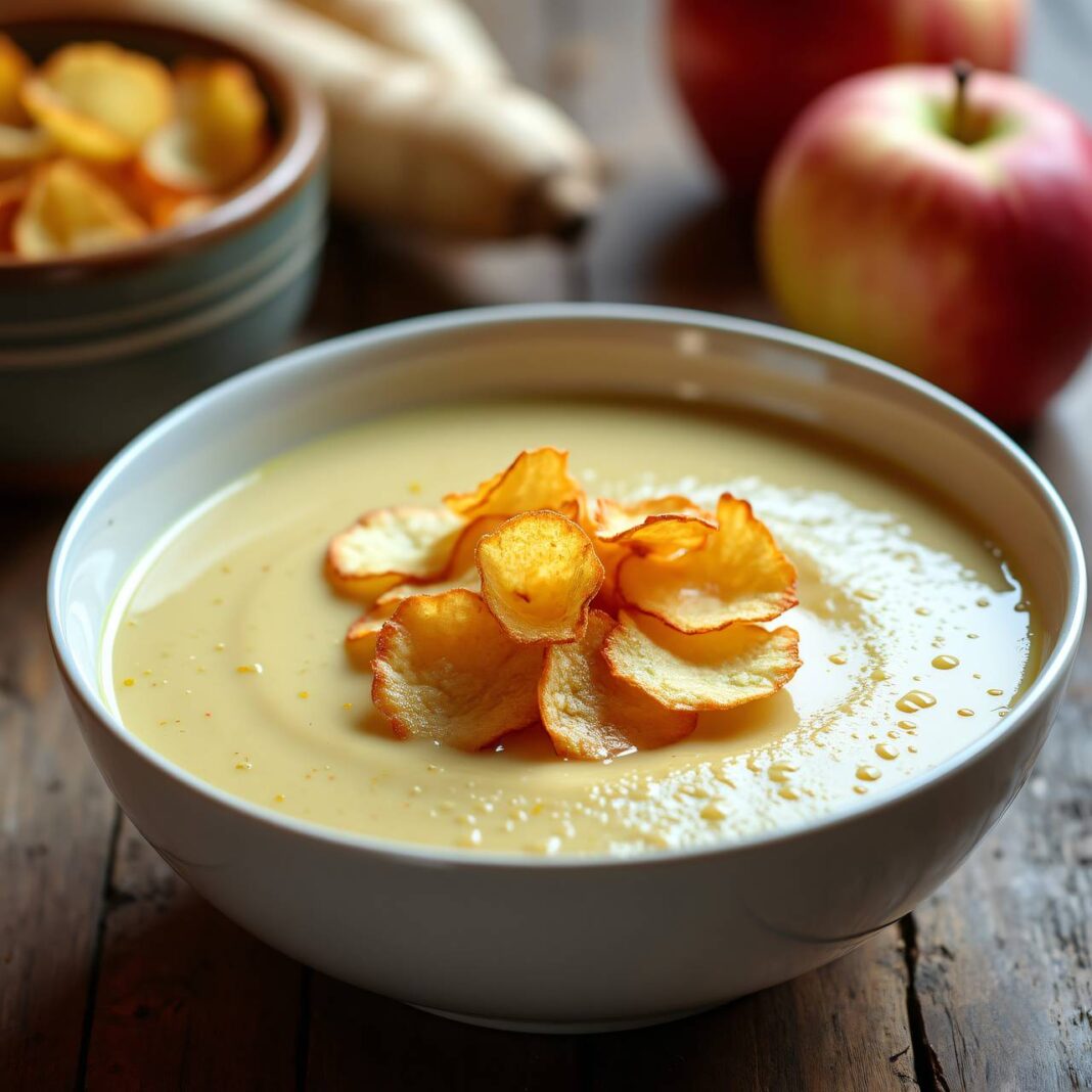 Eine cremige Suppe aus Pastinaken und Äpfeln, serviert mit knusprigen Pastinaken-Chips.