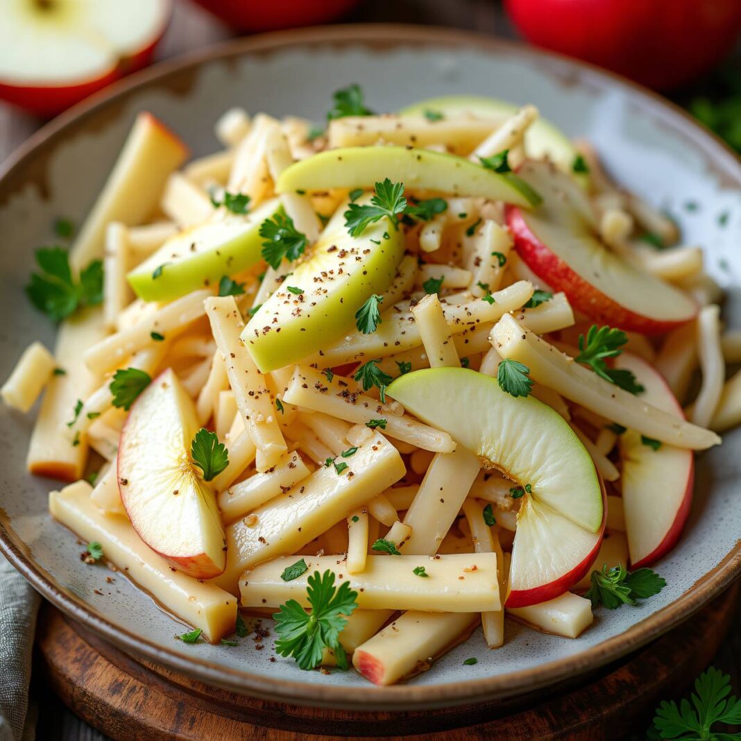 Ein erfrischender Salat aus Pastinaken und Apfel, serviert mit einer leckeren Joghurtsauce.