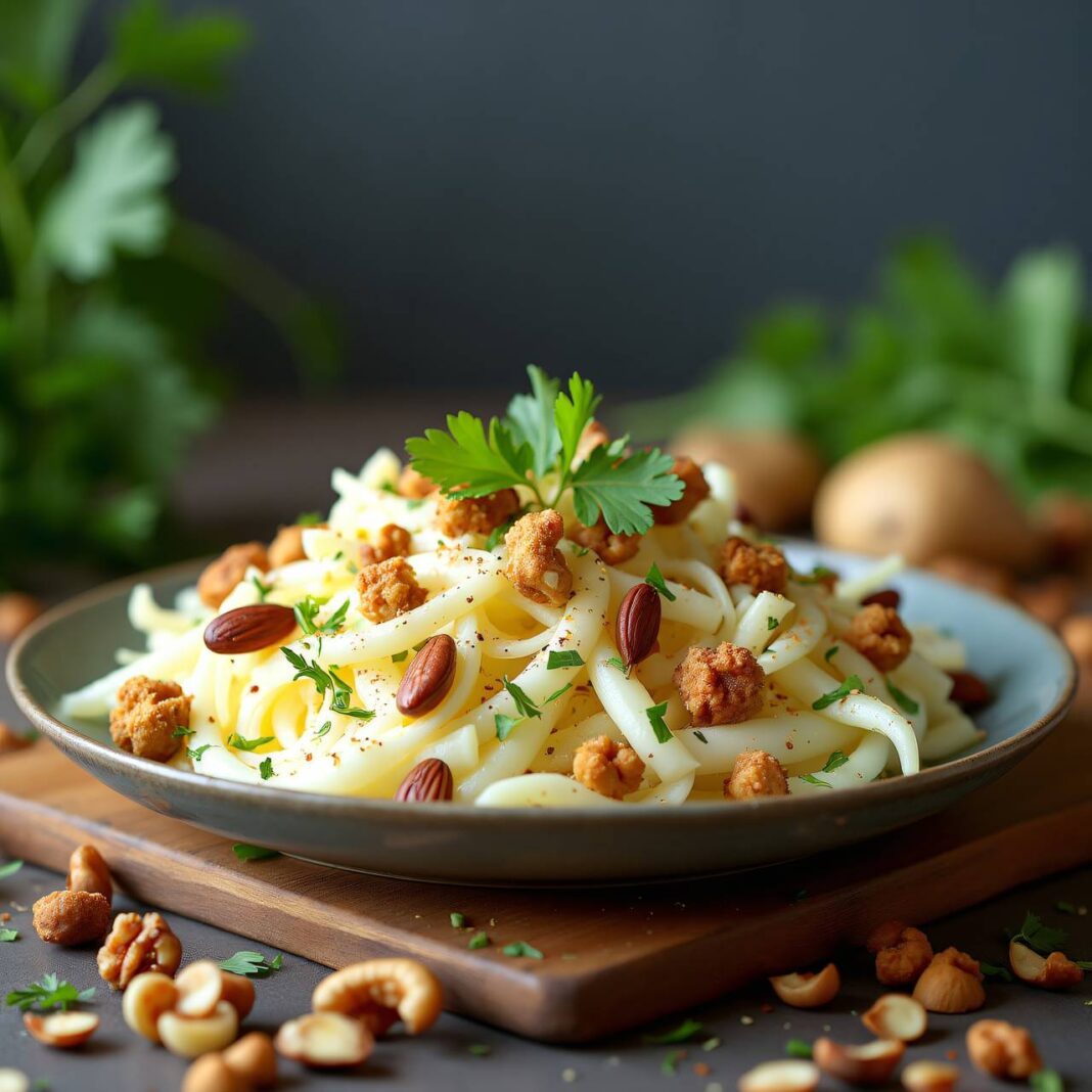 Ein erfrischender Pastinakensalat, verfeinert mit würzigen Nüssen und frischem Koriander.