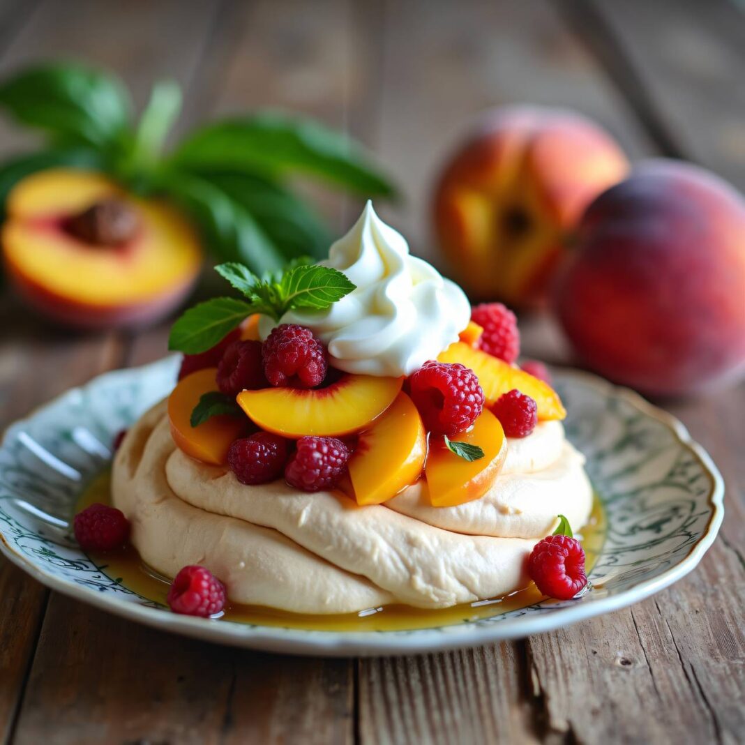 Eine köstliche Pavlova mit einem fruchtigen Pfirsichkompott und Himbeeren, ideal für ein festliches Dessert.