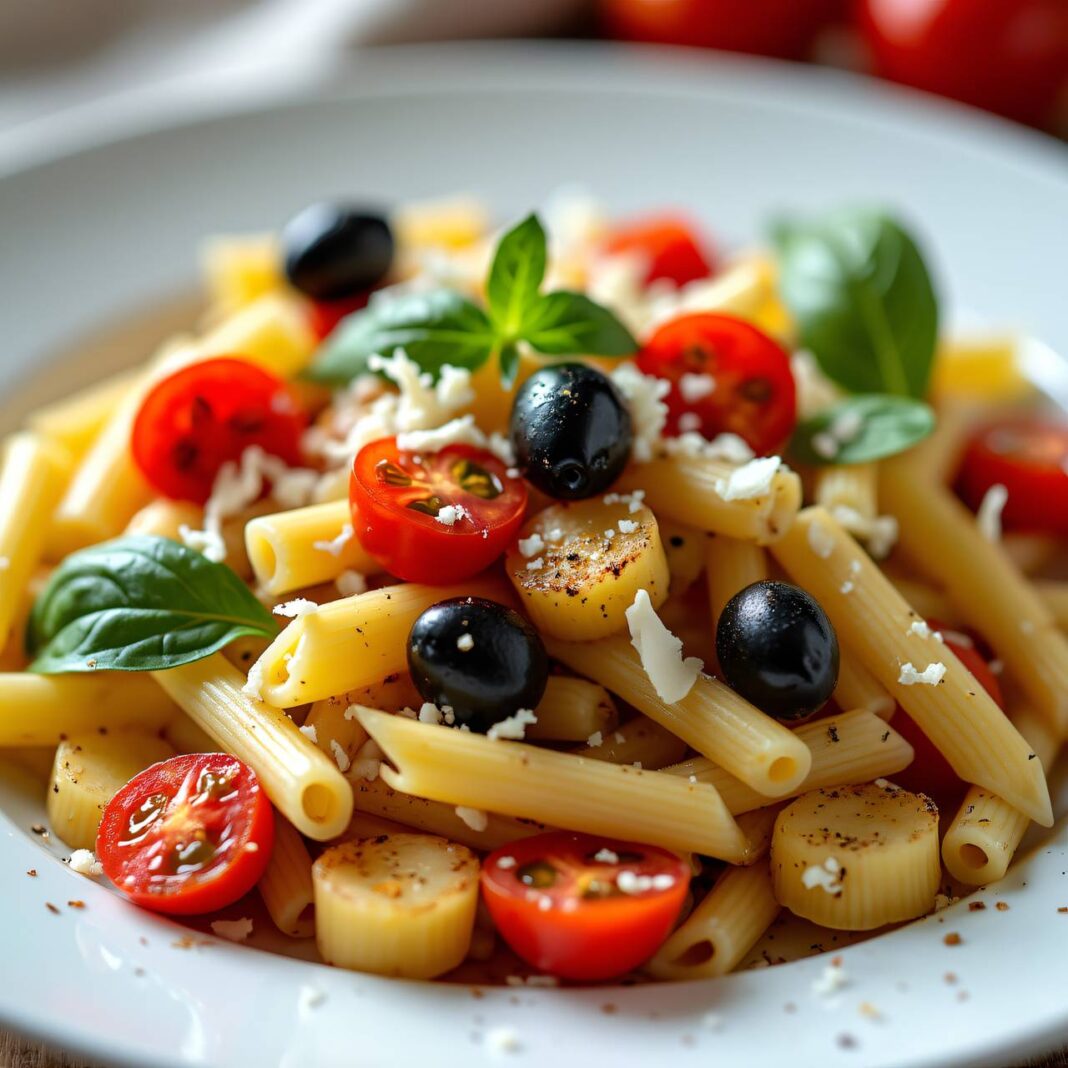 Ein erfrischender Penne-Kartoffelsalat mit Tomaten, ideal für warme Tage.