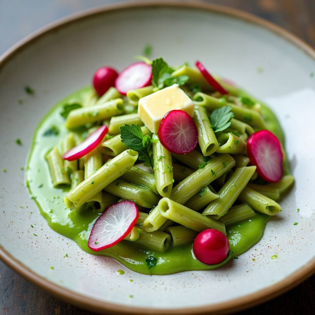Ein einfaches und schmackhaftes Rezept für Penne mit einer cremigen Bärlauchrahmsauce, garniert mit frischen Radieschen.