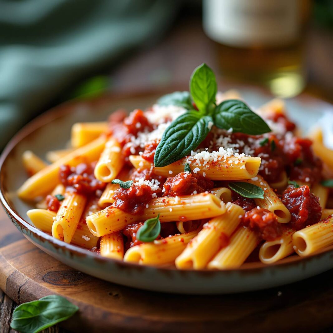Ein köstliches Rezept für Penne mit einer aromatischen Speck-Salbei-Sauce, serviert mit geriebenem Bergkäse.