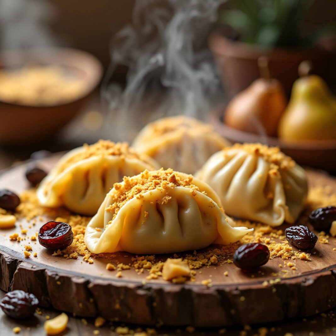 - Teig ausrollen: Den Nudelteig 3 mm dick ausrollen und in längliche Stücke von 5×14 cm schneiden. Jeweils 1-2 TL der Füllung auf die Teigstücke geben, die Kanten zurückschlagen und die Füllung gut bedecken. Die Teigränder mit etwas Wasser anfeuchten, den restlichen Teig über die Füllung schlagen und die Ränder gut andrücken. Die Enden einmal drehen, sodass „Schwänze“ entstehen.