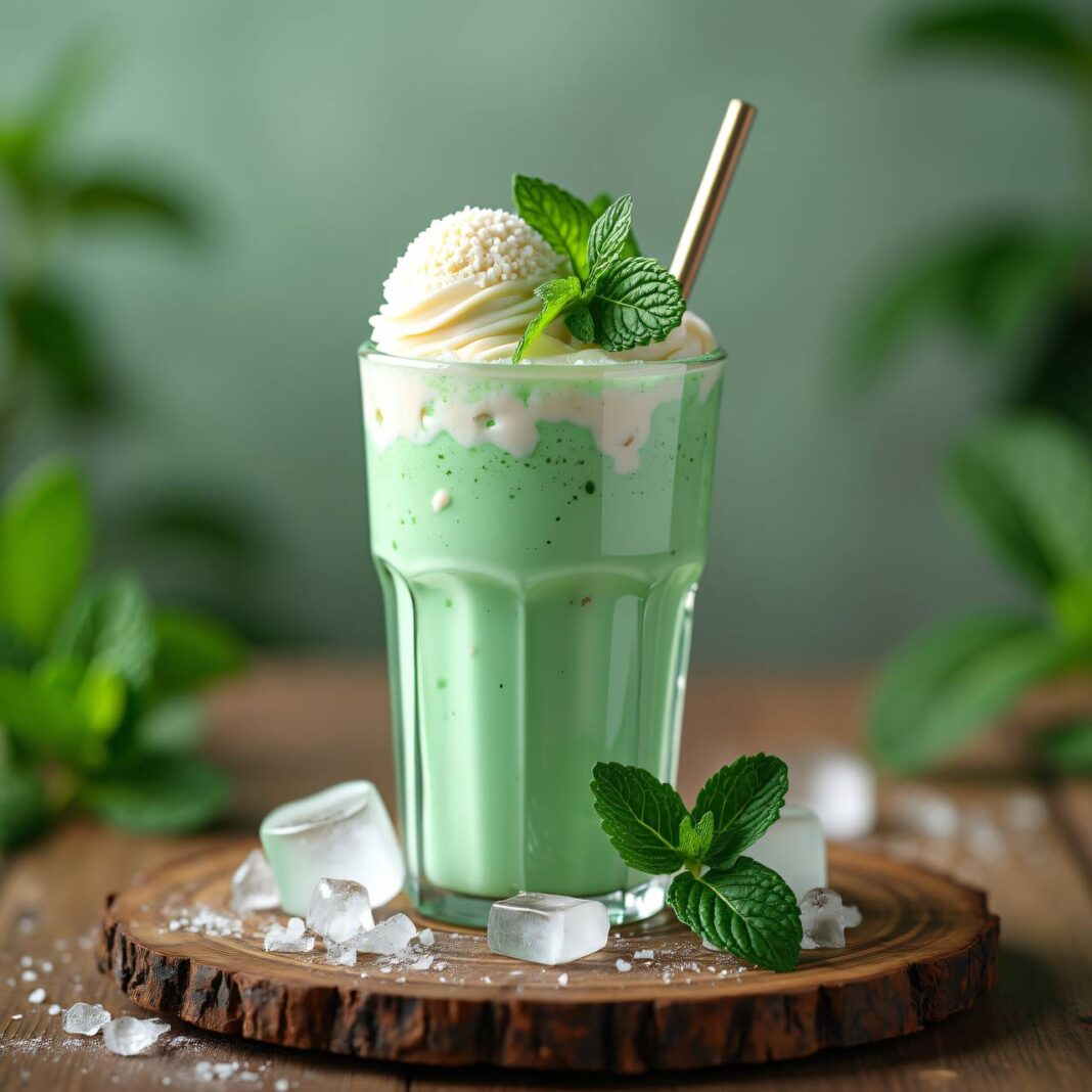 Ein erfrischendes Getränk aus Vollmilch, Vanilleeis und frischen Pfefferminzblättern.