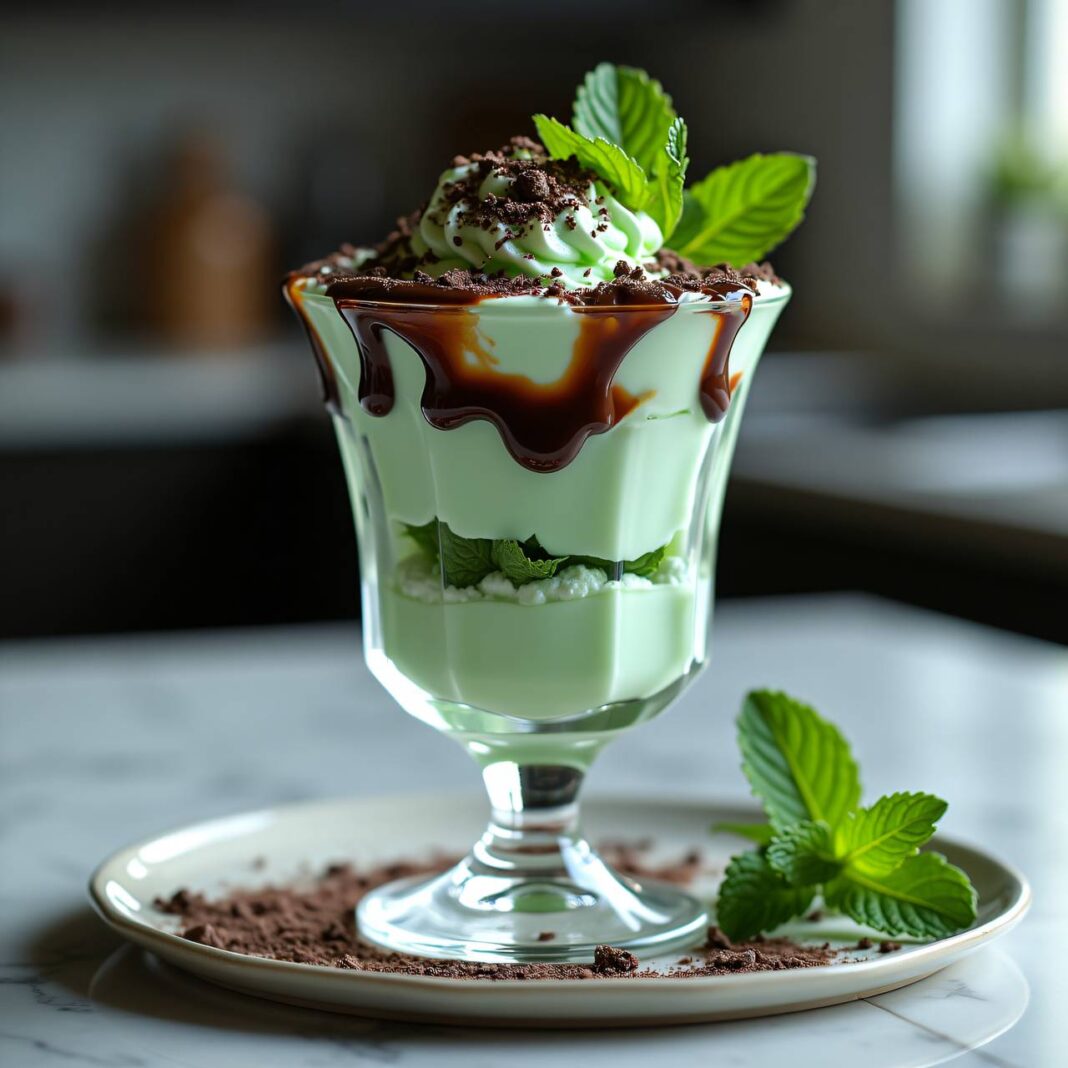 Ein erfrischendes Pfefferminz-Parfait, das mit einer köstlichen Schokoladensauce serviert wird.