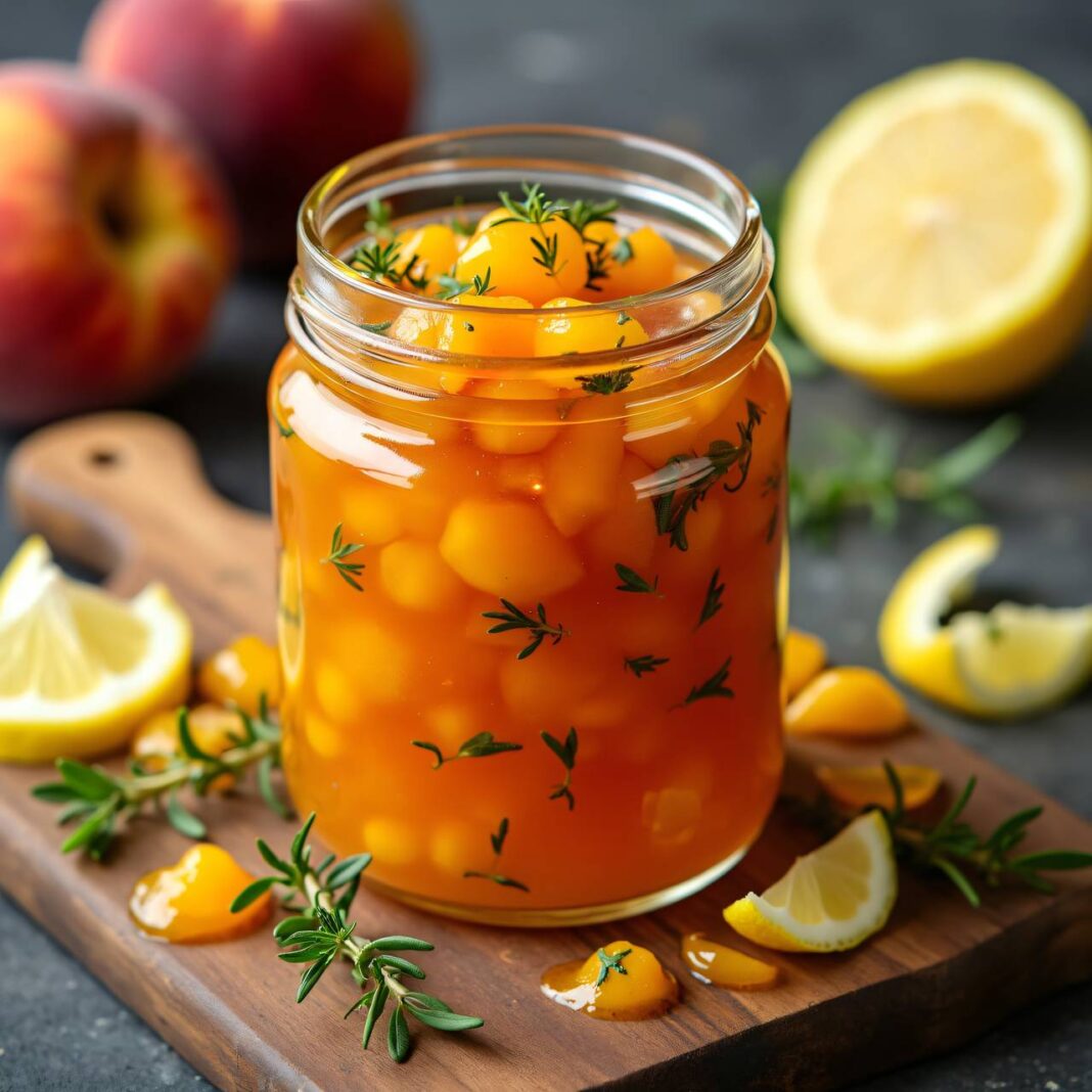 Eine köstliche Pfirsich-Konfitüre, verfeinert mit Zitronen-Thymian für einen besonderen Geschmack.