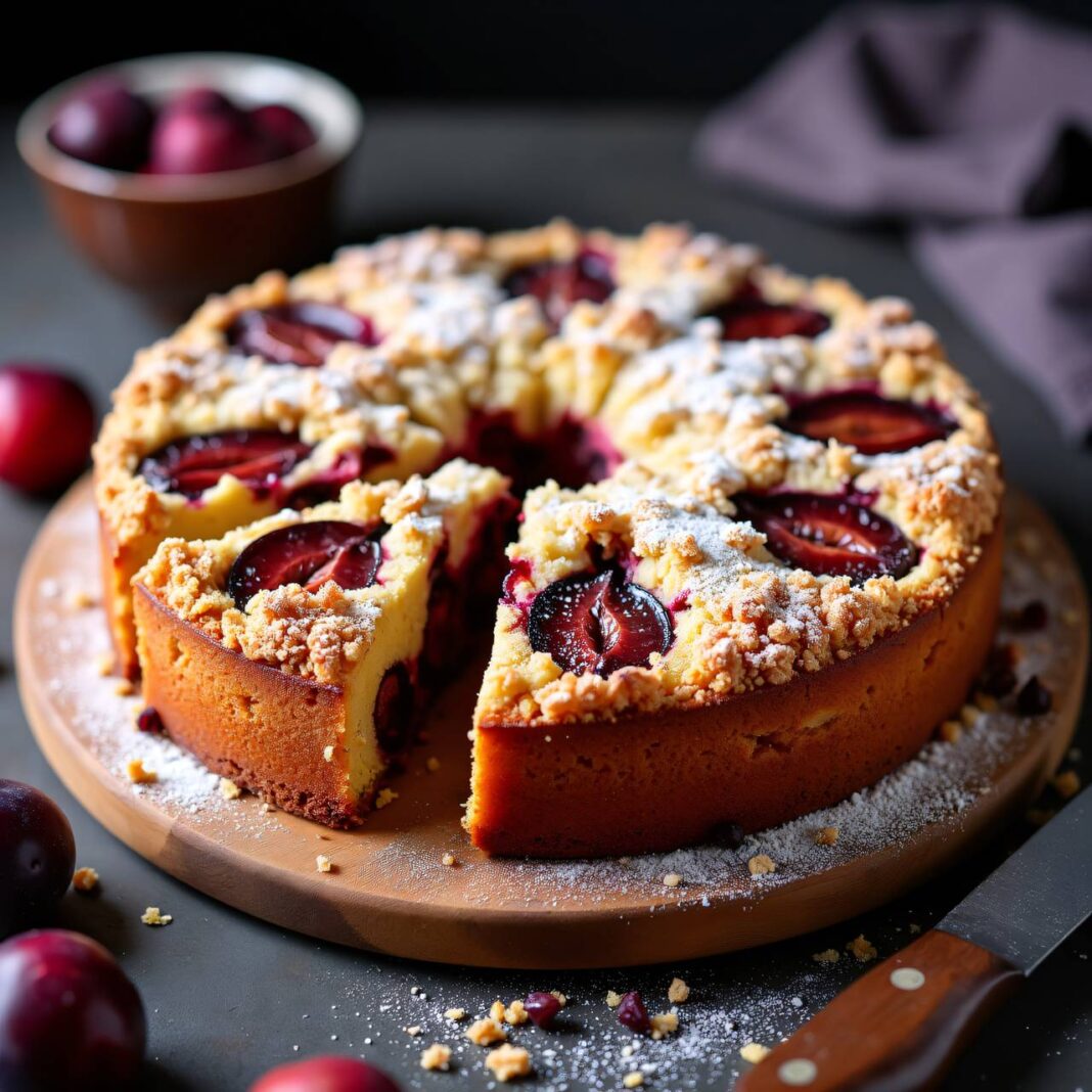 Ein saftiger Pflaumen-Streuselkuchen mit knusprigen Streuseln.