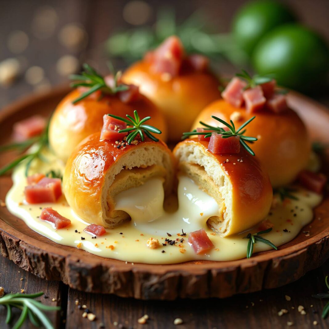 Ein leckeres Rezept für pikante Dampfnudeln gefüllt mit Mozzarella und Speck, serviert mit einer cremigen Sauce.