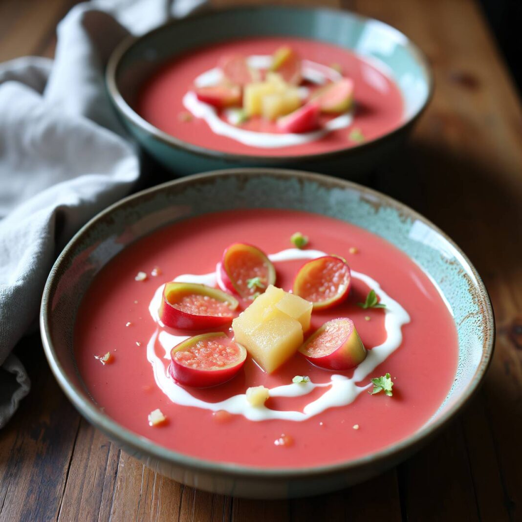 Eine köstliche und pikante Suppe aus Rhabarber und Kartoffeln, verfeinert mit einer Ingwer-Sahne.