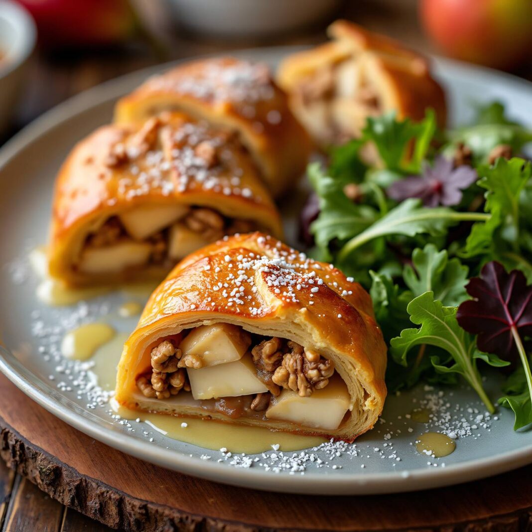 Ein köstlicher Strudel gefüllt mit Birnen und Blauschimmelkäse, serviert mit einem frischen Herbstsalat.