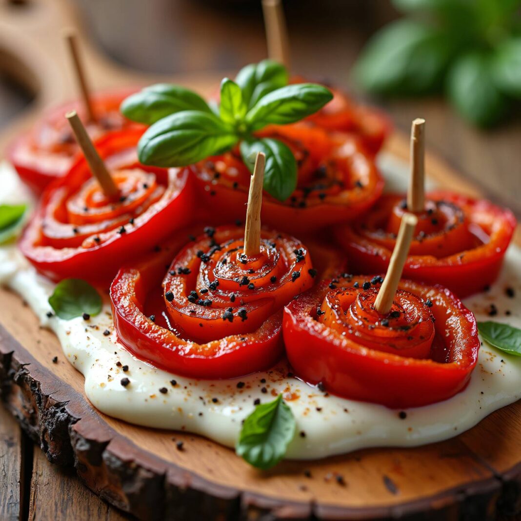 Schneiden Sie die restlichen Paprikaviertel in Streifen. Wickeln Sie die Streifen zu Schnecken und stecken Sie sie mit einem Zahnstocher fest. Servieren Sie die Papikraschnecken lauwarm auf dem Paprikarahm.