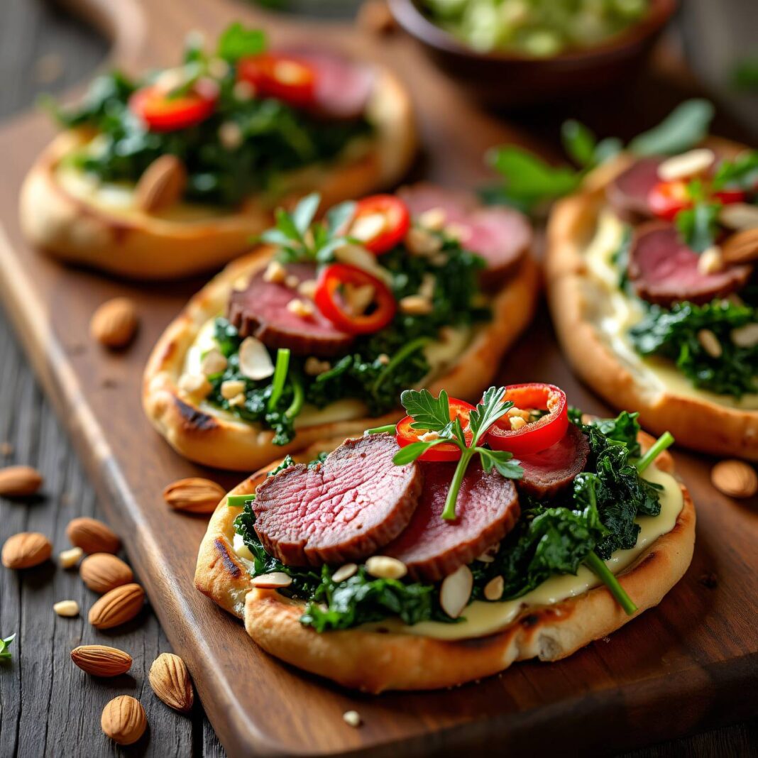 Leckere Pita-Toasts gefüllt mit saftigen Kalbssteaks, cremigem Käse und frischem Blattspinat.