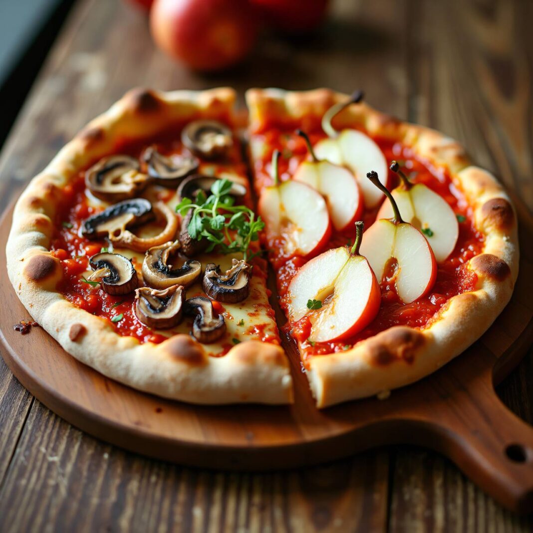 Ein köstliches Pizza-Rezept mit halb Dinkel- und halb Weizenmehl, belegt mit einer leckeren Mischung aus Käse, Champignons und Birnen.
