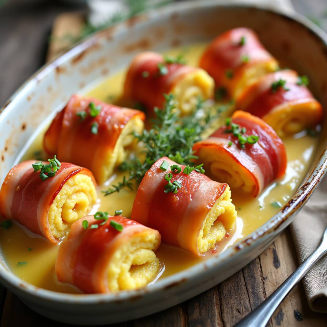 Leckere Polenta-Schinken-Rollen, gefüllt mit cremiger Polenta und umhüllt von Schinken, überbacken mit einer köstlichen Sauce.