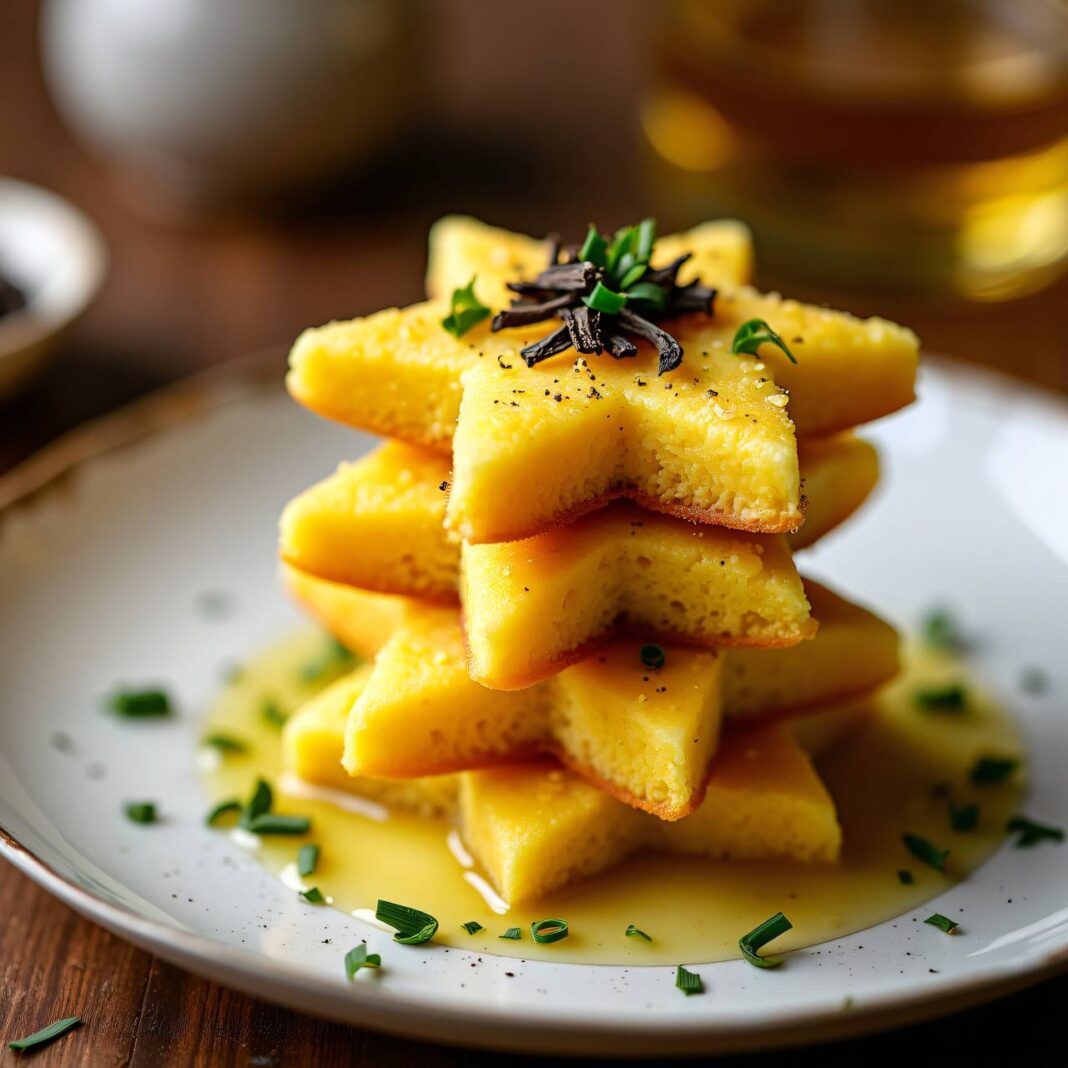 Ein köstliches Rezept für Polenta-Stern-Türmchen, garnierte mit Trüffel und Schnittlauch.