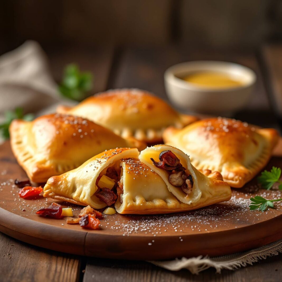 Leckere Empanadas gefüllt mit einer Mischung aus Raclettekäse, Speck, Birnen und weiteren köstlichen Zutaten.