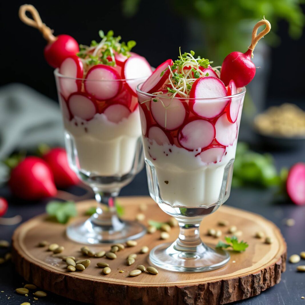 Ein erfrischender Cocktail aus Radieschen und Bierrettich, serviert mit einer cremigen Joghurt-Sauce.