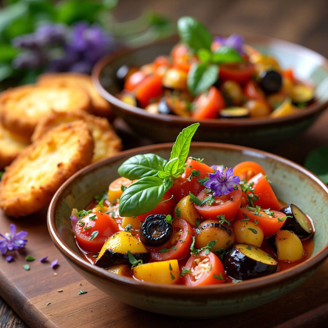 Ein köstliches Ratatouille, serviert mit knusprig paniertem Mozzarella.
