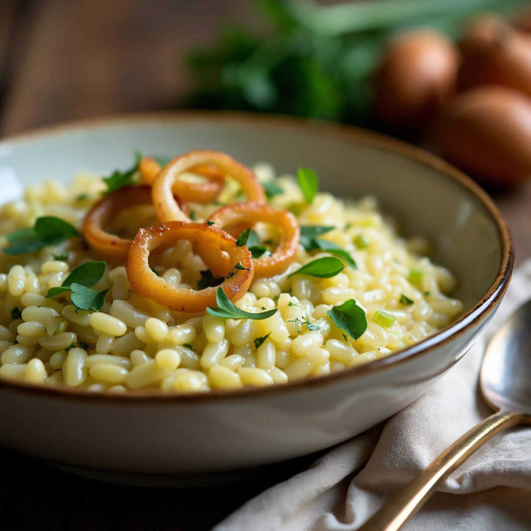 - In einer Pfanne die Schalottenringe in Bratbutter goldbraun braten. Diese dann über das fertige Risotto verteilen.