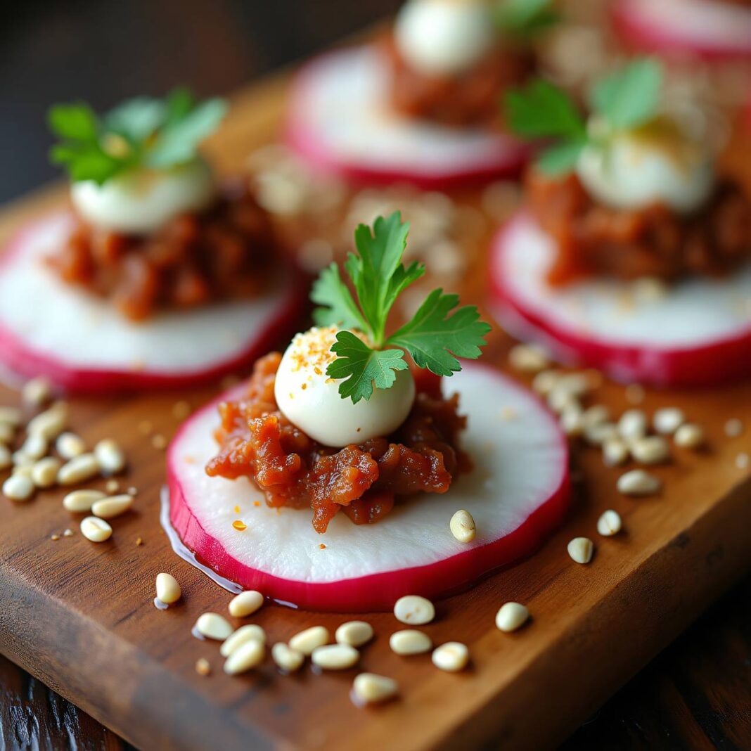 Leckere Rettich-Rondellen mit Ochsenmaulsalat und Crème fraîche, ideal als Fingerfood.
