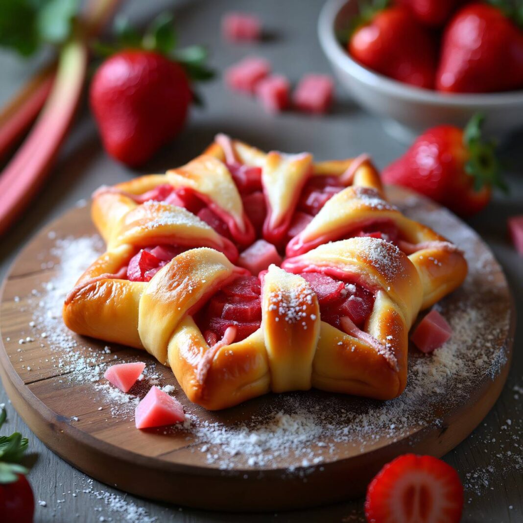 Ein köstlicher Hefestern mit einer feinen Füllung aus Rhabarber und Erdbeeren, verfeinert mit Marzipan.