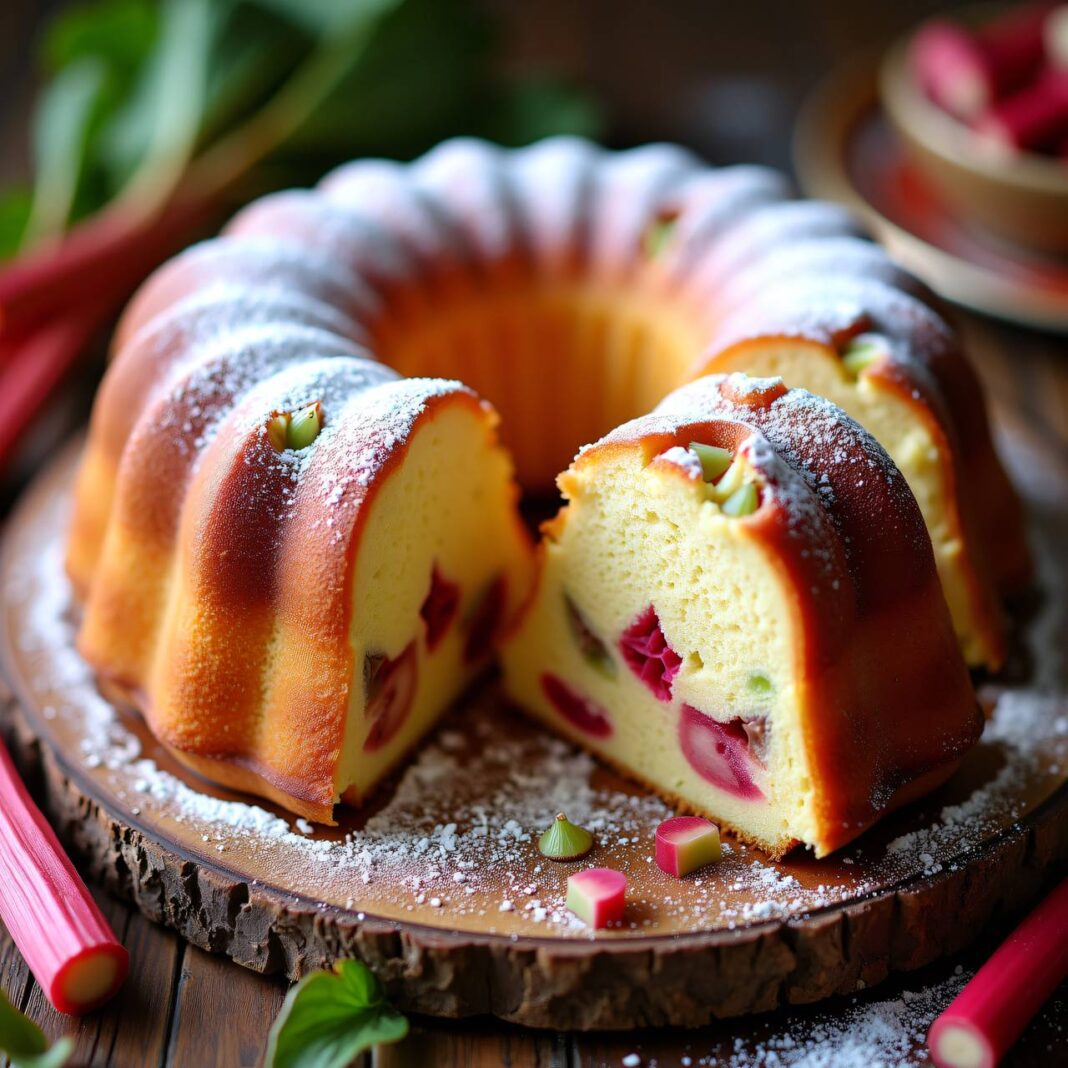Ein saftiger Gugelhupf mit Rhabarber und weißer Schokolade, perfekt für jeden Anlass.