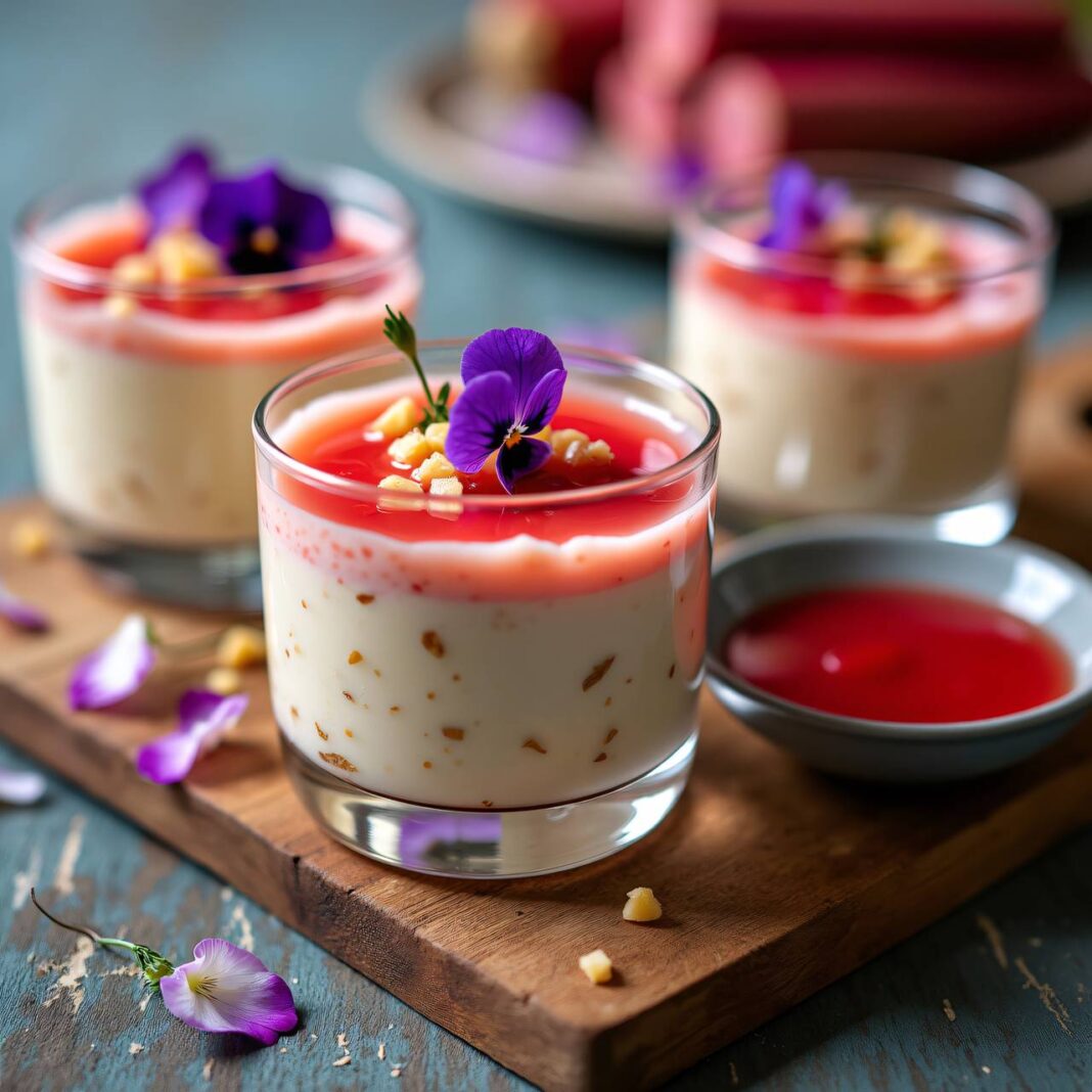 Ein erfrischendes Rhabarber-Ingwer-Parfait, das perfekt für warme Tage geeignet ist.