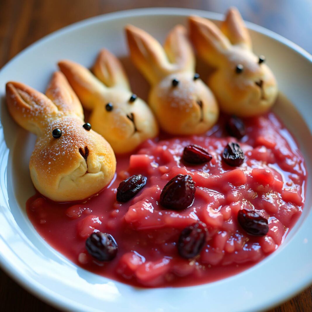 Ein köstliches Rhabarberkompott, serviert mit zartem Gebäck in Hasenform.