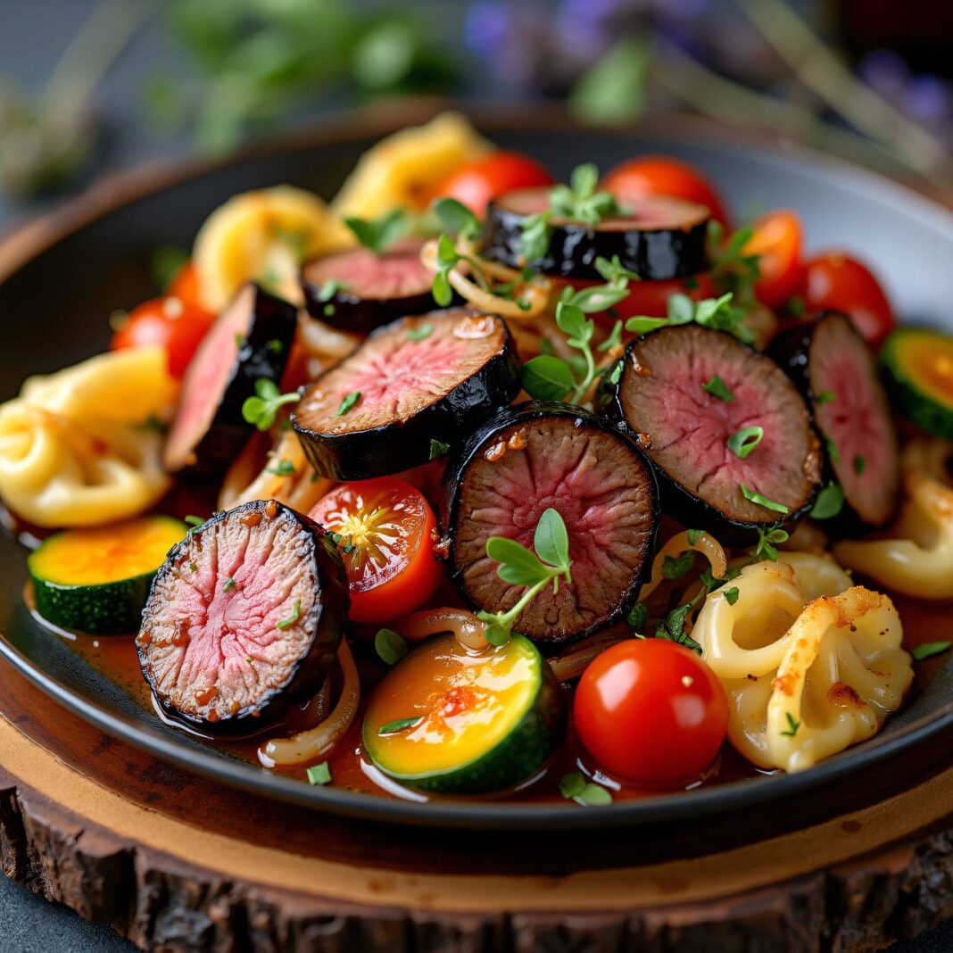 Eine leckere Rindfleischpfanne mit buntem Gemüse und Schupfnudeln.