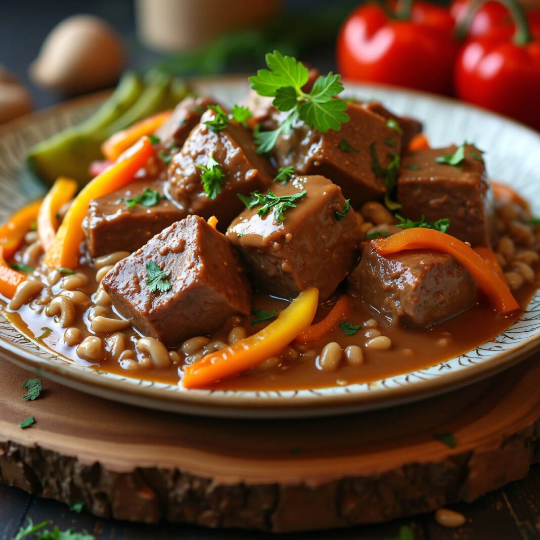 Ein köstliches Rindsfilet Stroganoff, zubereitet mit frischen Zutaten und einer cremigen Sauce.