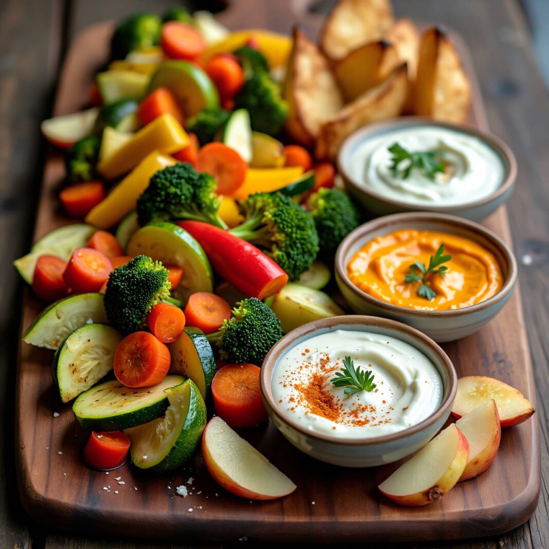 Ein leckeres Gericht mit gemischtem Gemüse und drei verschiedenen Dips, perfekt für einen gesunden Snack oder als Beilage.