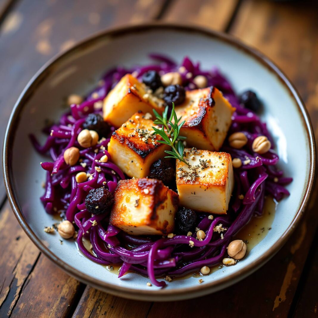 Ein schmackhaftes Gericht aus zartem Rotkraut mit Rosinen und saftigen Hühnerwürfeln, ideal für ein herzhaftes Abendessen.