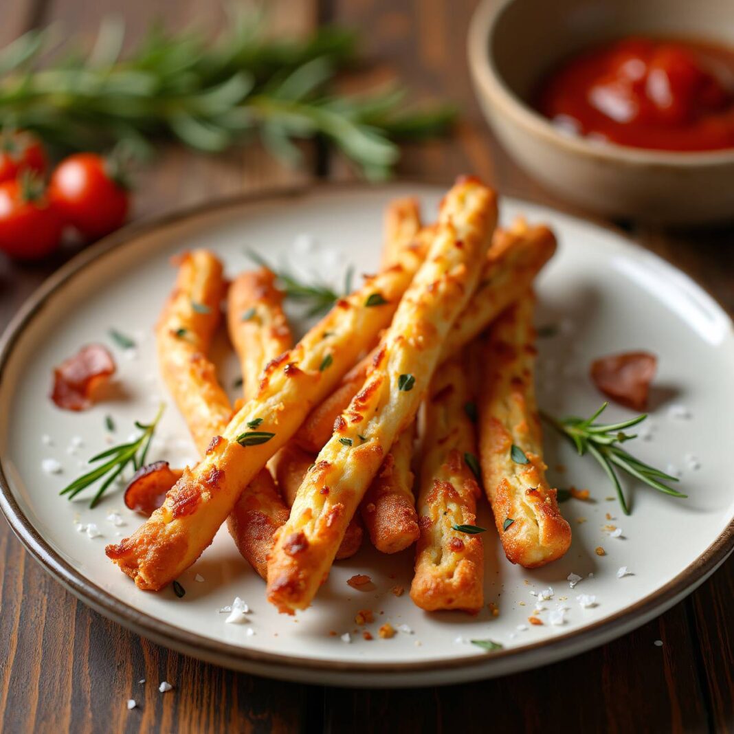 Knusprige Grissini mit Speck und Rosmarin, ideal als Snack oder Appetizer.
