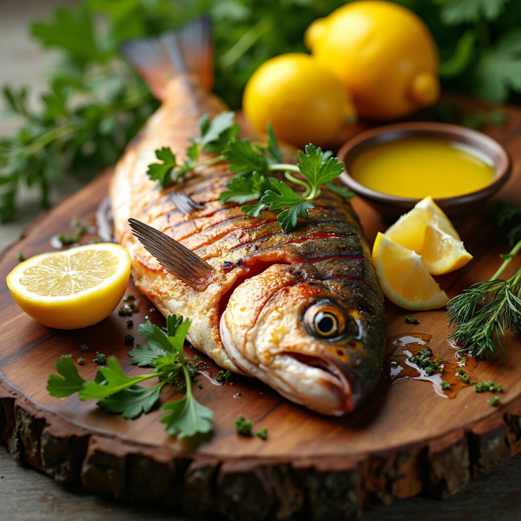 Leckere Rotbarben, mariniert mit einer Zitronen-Öl-Sauce und auf dem Grill zubereitet.