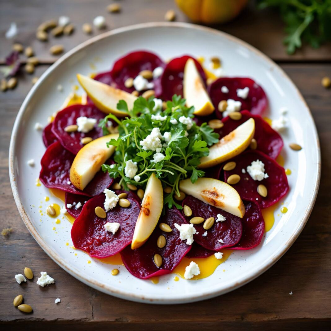 Ein köstliches und gesundes Rote Rüben-Carpaccio, garniert mit Feta und angedünsteten Birnen, perfekt als Vorspeise oder leichtes Hauptgericht.