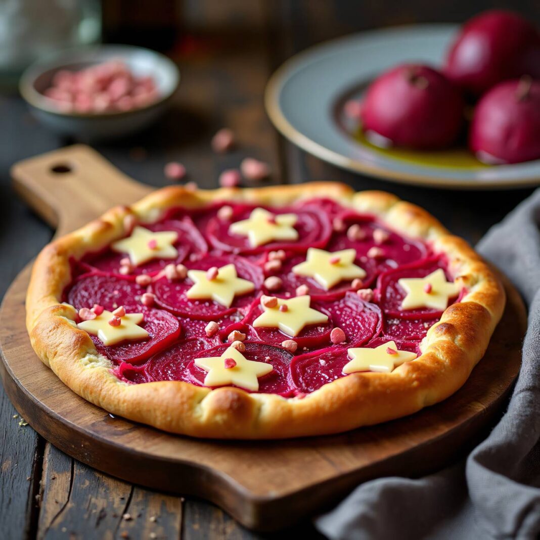 Eine köstliche Focaccia mit roten Rüben und Schinken, perfekt als Snack oder Beilage.