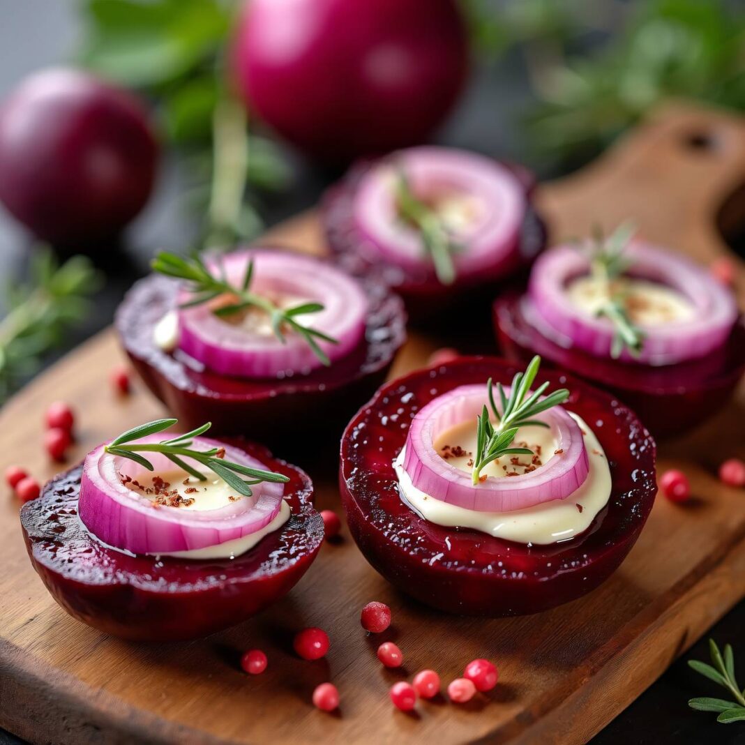 Delikate Häppchen aus roten Rüben, Weichkäse und roten Zwiebeln, ideal für Partys und als Vorspeise.