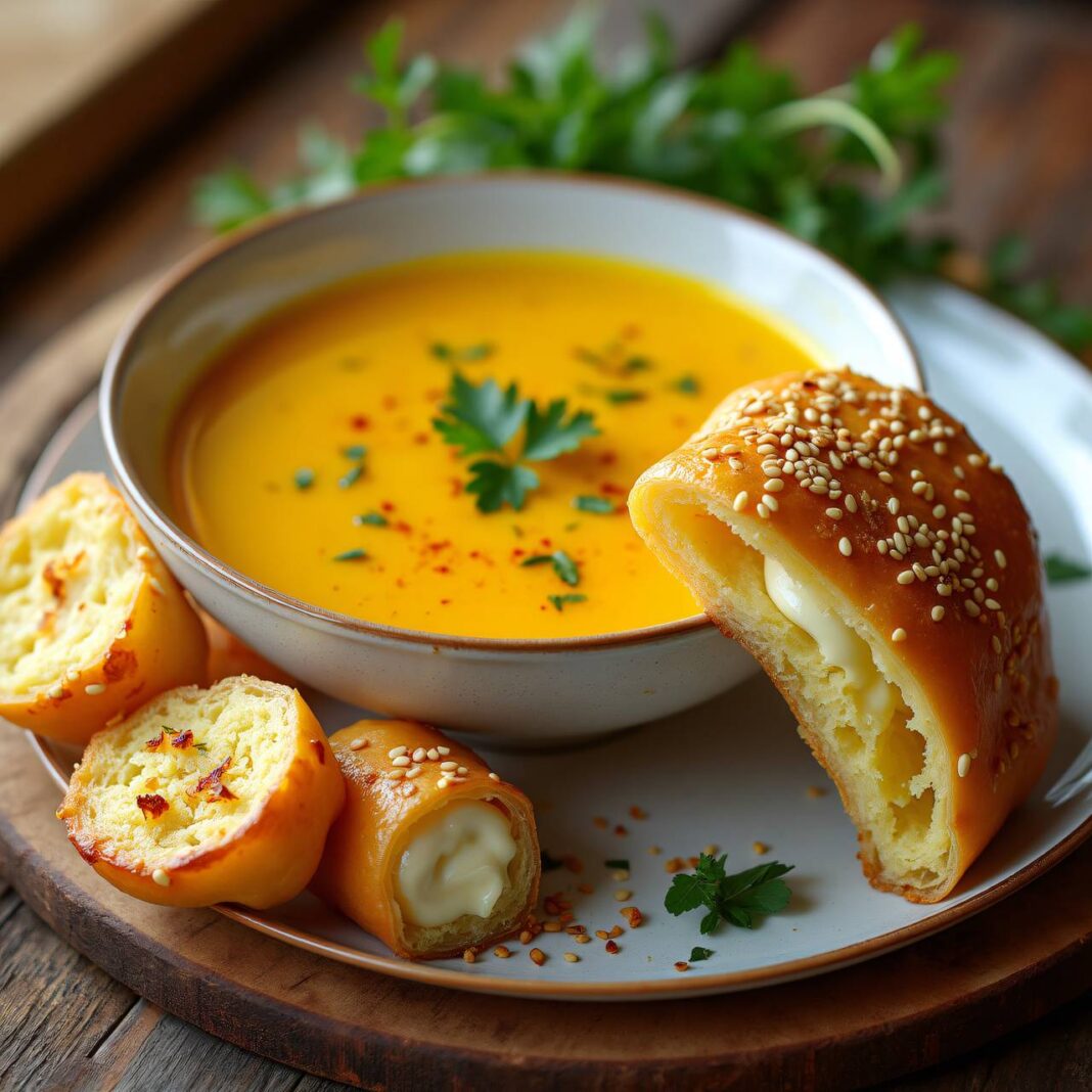 Eine köstliche Suppe mit Safran und zarten Frischkäse-Sesam-Röllchen, ideal für ein besonderes Essen.