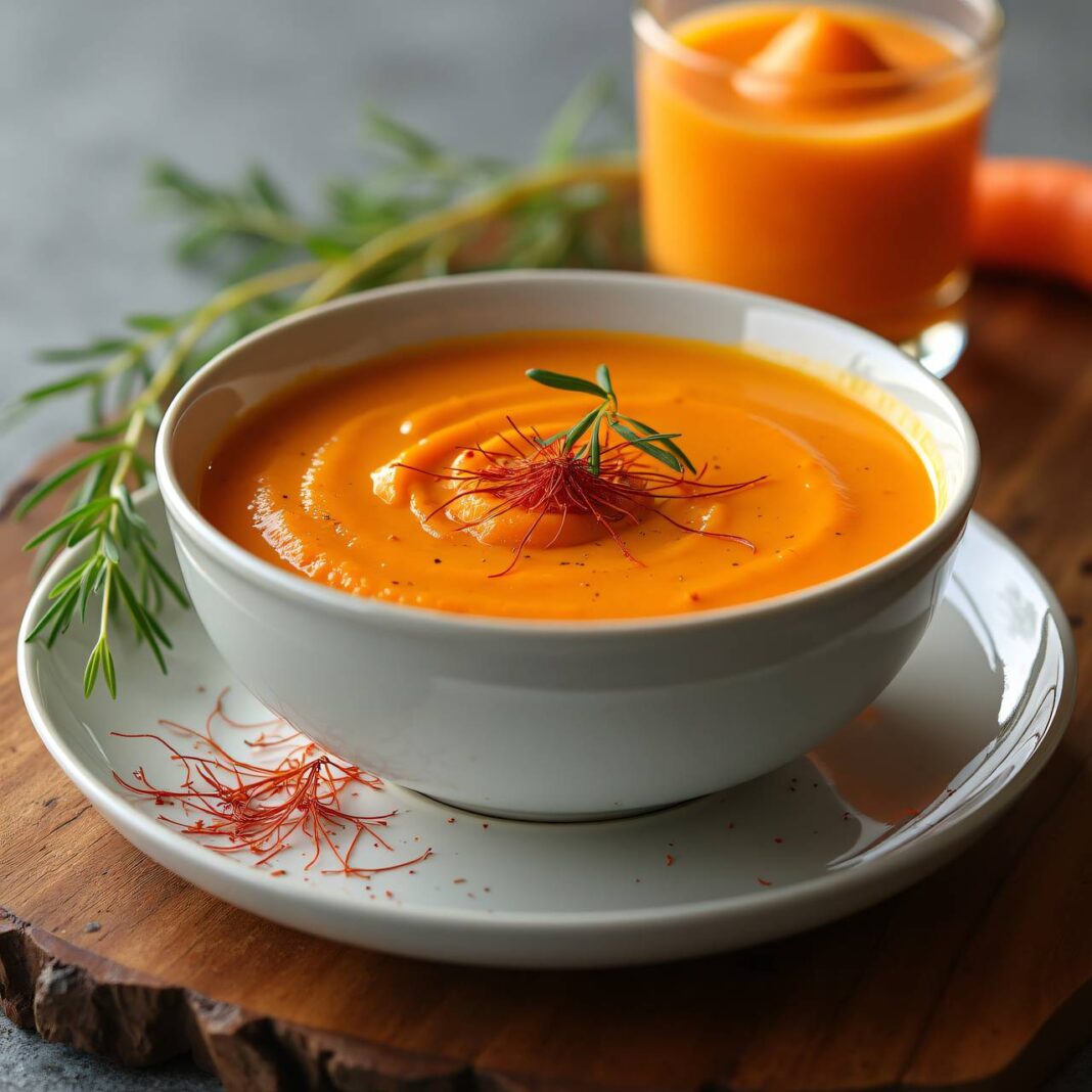 Eine köstliche Kombination aus einer aromatischen Safransuppe und einem erfrischenden Karottensorbet.