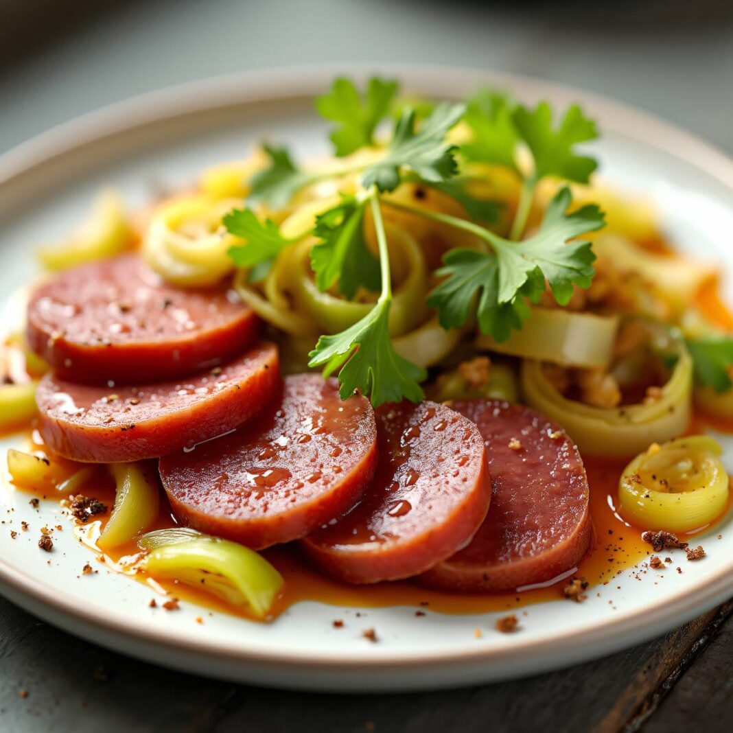 Ein köstliches Rezept für Saucisson, serviert mit zartem Lauch und frischem Endiviensalat.