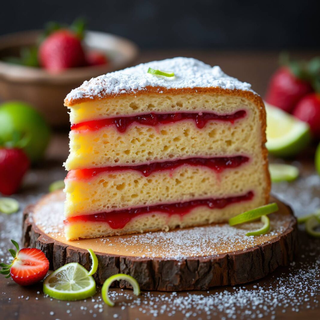 Ein köstlicher Schichtkuchen mit einer Füllung aus Erdbeermarmelade und Limetten.